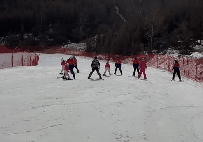 有一对一教练教着,每个人都学得认真。张杰左后侧就是最小的女儿小咘芽,快5岁了,站在双板上身体还有点僵硬,正在教练指导下学站立。最前面两个穿粉色的是8岁双胞胎跳跳和俏俏,背影看姐妹俩身形修长,个头都挺高。分不清谁是姐姐谁是妹妹,但从滑雪动作看,她们身体略微侧向,正在滑行或准备转弯,姿态稳健又放松。