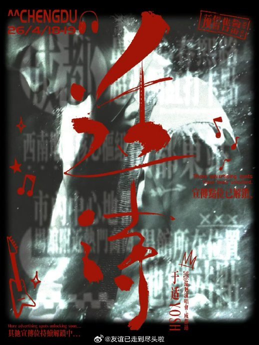 于适将于4月18日至19日在成都举办“适诗2026巡回演唱会”,预告演绎24首原创曲目,含摇滚版《将进酒》及未公开Demo,主题强调“声自成诗,意向远方”。演唱会双场门票售罄,成都全城覆盖宣传物料,粉丝应援聚焦“摇滚赴野”主题。