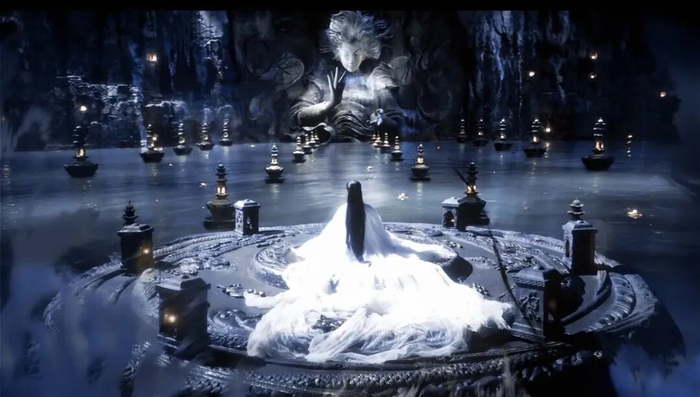 导演高度风格化的镜头语言和超现实美学,是这部作品AI感的核心来源。从《小时代》到《晴雅集》,从《云之羽》到《大梦归离》,郭敬明的审美体系一以贯之:华丽、极致、不容瑕疵,《月鳞绮纪》同样延续了他独有的华丽美学,对称构图、冷调光影、绮丽纱衣,致力于将每一帧都拍成壁纸。