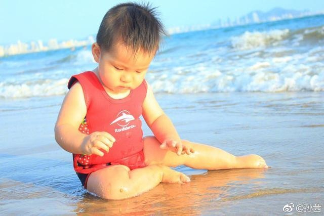 孙茜发文写到:在他眼里,海浪可能是个长得扁扁的,淘气的小动物,还沉不住气,忍不了两秒钟就肯定会跑上来故意逗他一下,然后转身就逃跑,小胖子被惹的咯咯咯笑,像海浪在挠他的痒痒肉