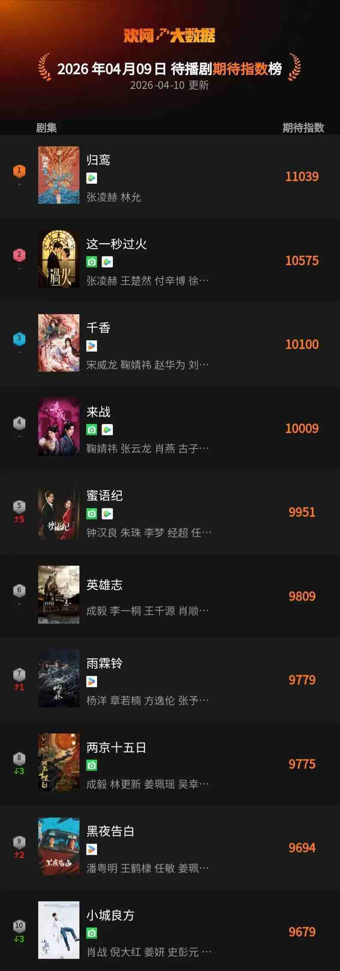 4月9日 欢网大数据【待播剧】期待指数TOP10来了!