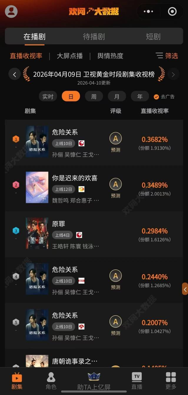 4月9日 欢网大数据【卫视黄金时段】剧集直播收视率来啦!