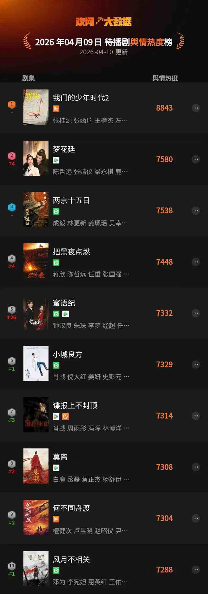 4月9日 欢网大数据【待播剧】舆情热度TOP10来了!