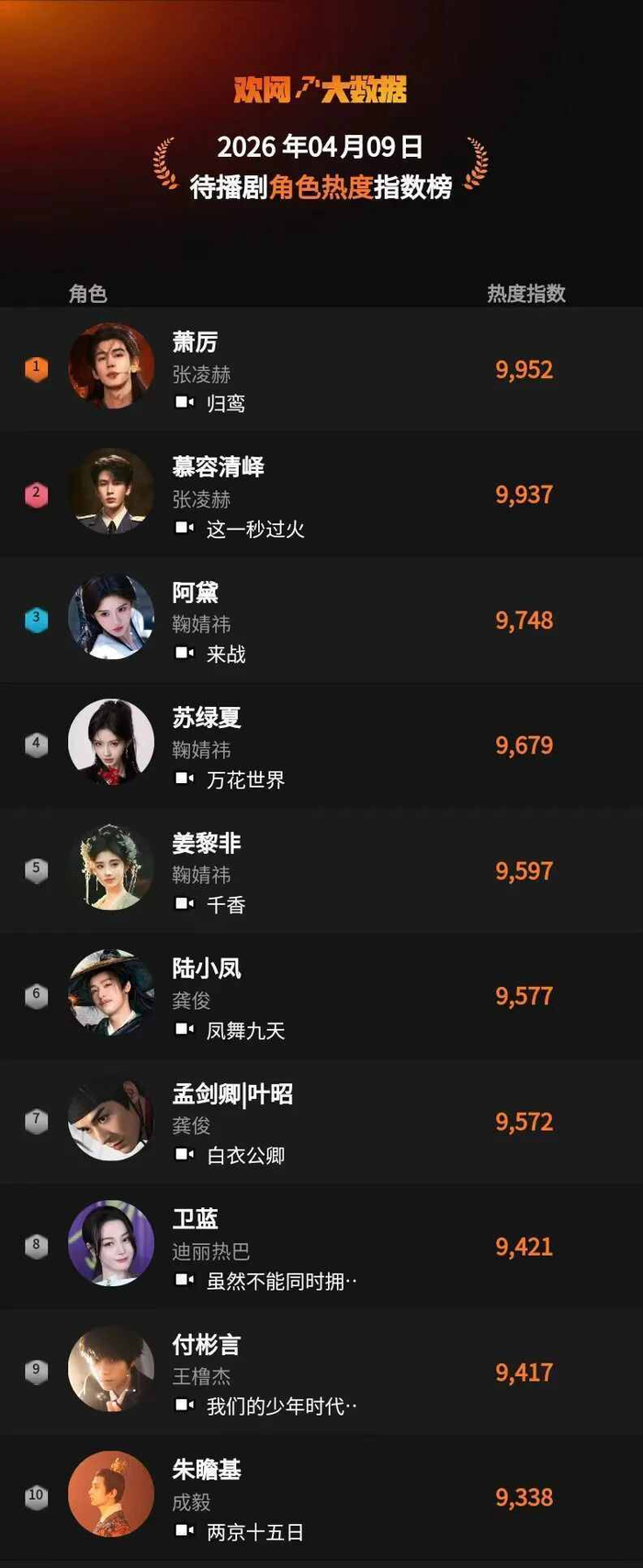 4月9日 欢网大数据【待播剧】角色热度指数TOP10来啦!