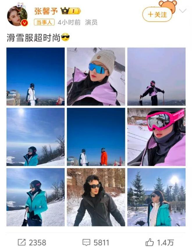 中午时分,张馨予在个人账号晒出了一组图,内容是和老公的滑雪照。