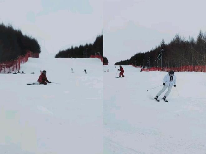 只见视频中有两个人,一个穿白衣,一个穿红衣。穿红色滑雪服的稍不留神就摔倒了,穿白色滑雪服的技术高超。