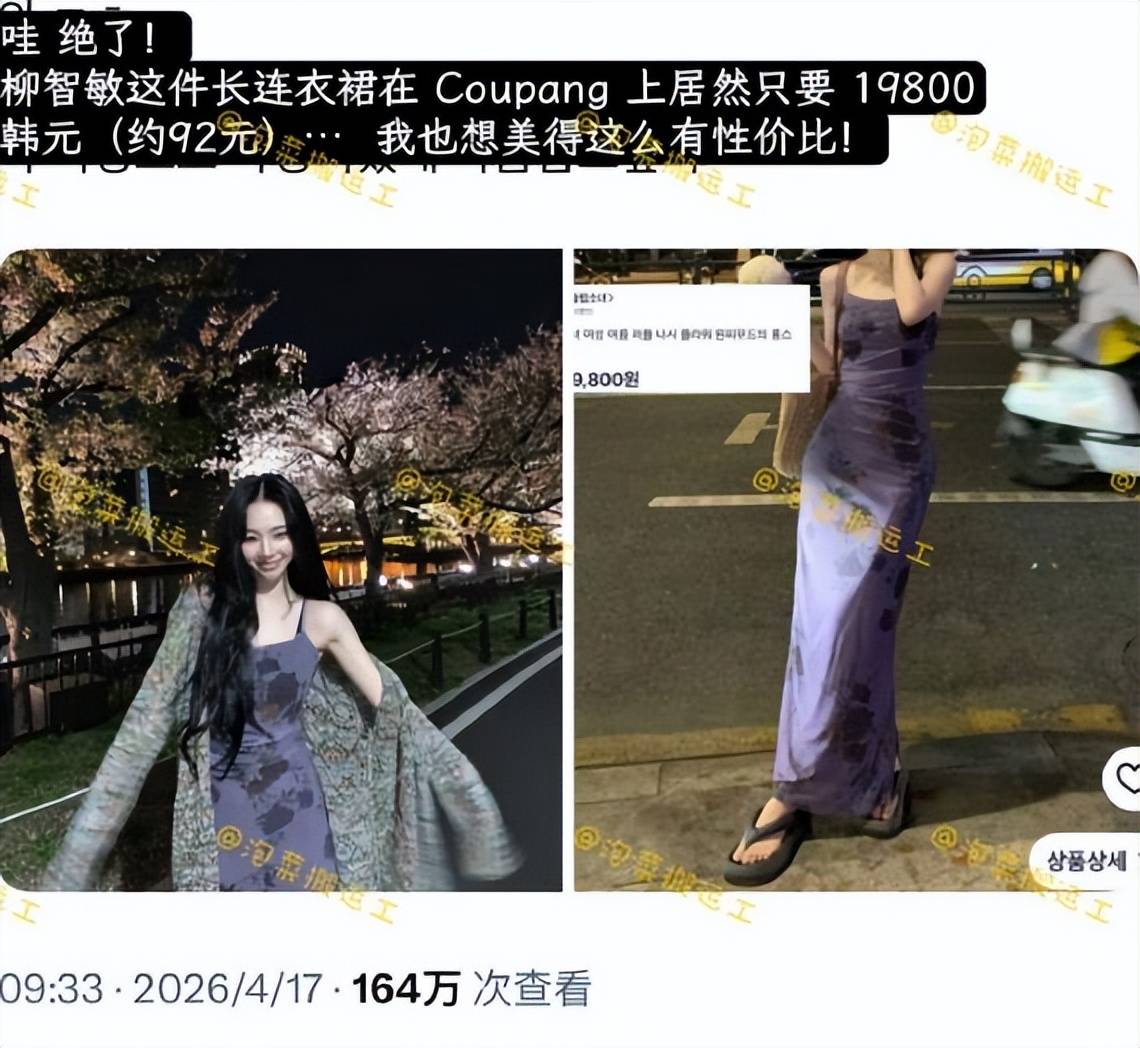 写真中,柳智敏立于樱花树下,身着一袭淡紫色水墨网纱雪纺长裙。裙子采用收腰剪裁与不规则开叉设计,外搭彩色针织开衫,垂坠感面料在光影中流动,与她清冷灵动的气质结合,营造出朦胧的春日仙气。然而,这款被赞“仿佛高定”的裙子,在韩国电商平台的售价折合人民币仅约92元(19800韩元),与明星造型中动辄成千上万的奢侈单品形成巨大反差。