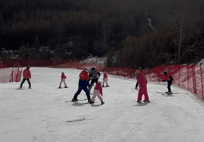 有一对一教练教着,每个人都学得认真。张杰左后侧就是最小的女儿小咘芽,快5岁了,站在双板上身体还有点僵硬,正在教练指导下学站立。最前面两个穿粉色的是8岁双胞胎跳跳和俏俏,背影看姐妹俩身形修长,个头都挺高。分不清谁是姐姐谁是妹妹,但从滑雪动作看,她们身体略微侧向,正在滑行或准备转弯,姿态稳健又放松。