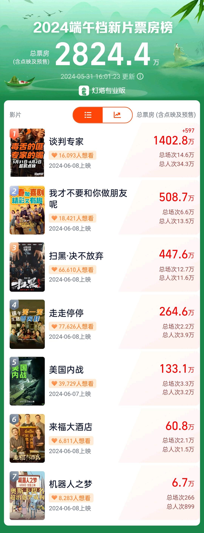 据灯塔专业版,截至5月31日16时许,今年端午档暂时票房领先的电影为《谈判专家》。