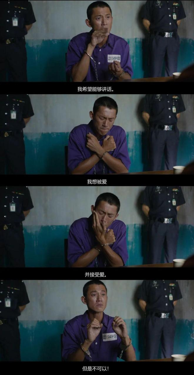 在《富都青年》中,他饰演聋哑人阿邦。最震撼的一场戏是阿邦被判死刑后与法师的临终倾诉。导演将“真听真看真感受”用到极致:吴慷仁的剧本上只有“控诉”二字,没有一句台词;与他演对手戏的是为死囚弘法三十余年的开照法师,同样没有剧本。那些控诉全凭手语和神情完成——小心翼翼观察周遭的眼神,手腕铁链砸在桌上的声响,在眼眶里转了许久却始终未落的眼泪。