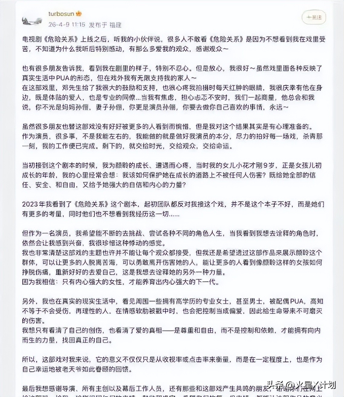 此前,演员梅婷曾在微博上将自己25年前饰演的家暴受害者“梅湘南”与孙俪新剧角色“颜聆”进行对比,指出伤害换了面孔但觉醒从未缺席。