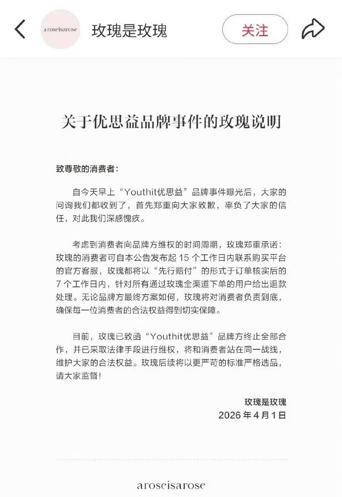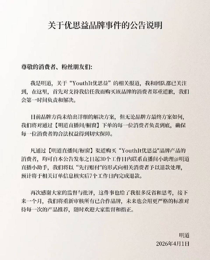 4月1日,演员明道发布关于优思益品牌事件的公告说明,表示自己与团队已关注到关于“YouthIt优思益”的相关报道,“首先对支持我信任我而购买该品牌的消费者郑重道歉,我们会第一时间负责和解决”。