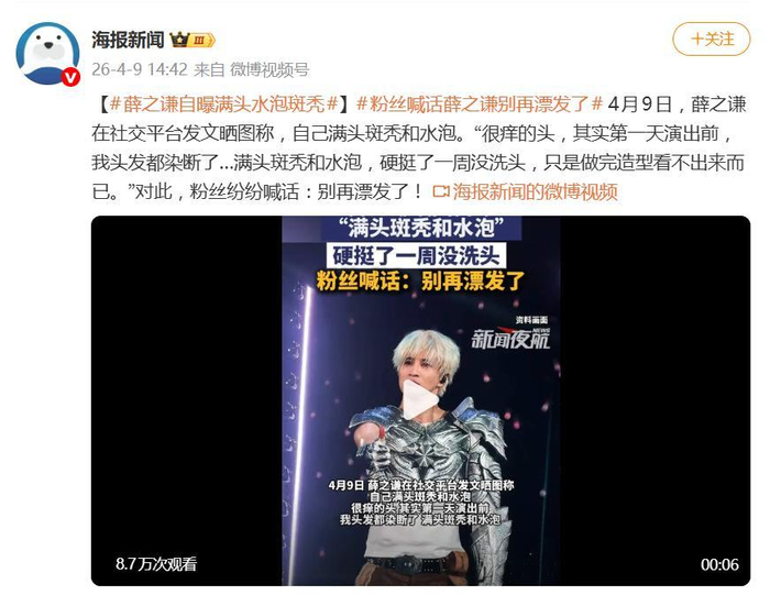 据4月9日报道,薛之谦在社交平台的一则发文,直接让粉丝炸了锅。他晒图并写道:“很痒的头,其实第一天演出前,我头发都染断了…满头斑秃和水泡,硬挺了一周没洗头,只是做完造型看不出来而已。”这番轻描淡写的描述,背后却是为舞台形象付出的惊人代价。