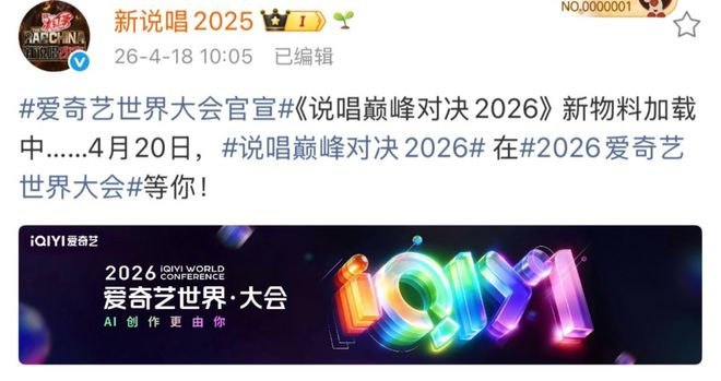 《新说唱》官博官宣《说唱巅峰对决2026》新物料加载中……4月20日公布!