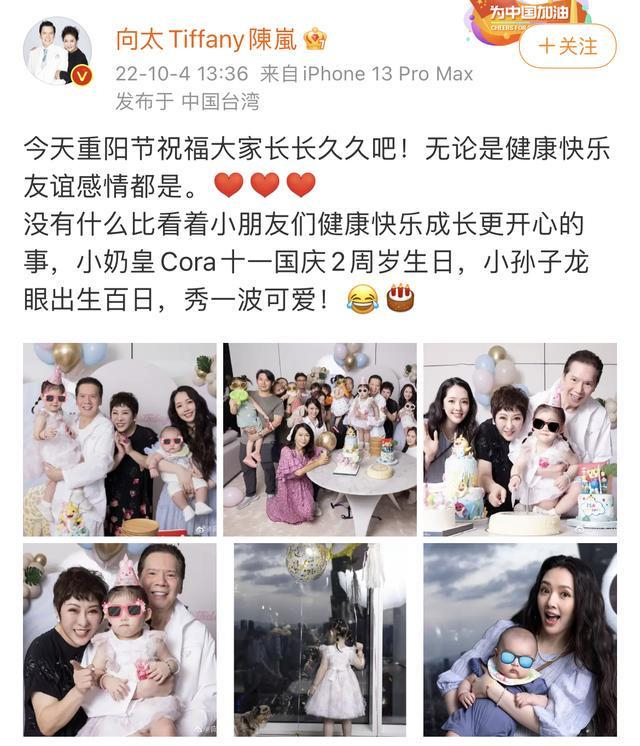 向太在微博表示:“今天重阳节祝福大家长长久久吧!无论是健康快乐友谊感情都是。没有什么比看着小朋友们健康快乐成长更开心的事,小奶皇Cora十一国庆2周岁生日,小孙子龙眼出生百日,秀一波可爱!”