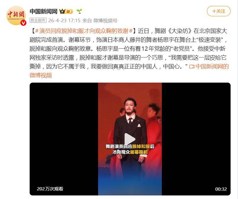 面对突如其来的全网关注,杨思宇本人也很快作出了回应。他在接受中新网独家采访时透露,这个“脱和服谢幕”的巧思其实来自导演。“我需要把这一层皮给它撕掉,因为它不属于我,我要做回真真正正的中国人,中国心。”杨思宇解释道,导演希望在谢幕时完成一个从戏里到戏外的身份转变,通过剥离和服回到演员本身,向观众表达更真挚的情感与感谢。