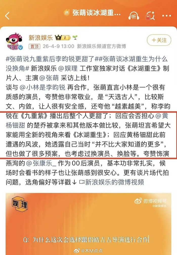 冰湖重生前五集戏份拉表:黄杨钿甜>张康乐>李昀锐 ……张萌说冰湖重生考虑过给黄杨钿甜的角色换演员、换脸等…李昀锐天选古人,张康乐基本功非常扎实。话说 李昀锐戏份这么少吗?戏份时长拉表,粉丝在向张萌维权!瓜主都出来为李昀锐说话了,同时放了影视瓜剑阁闻铃