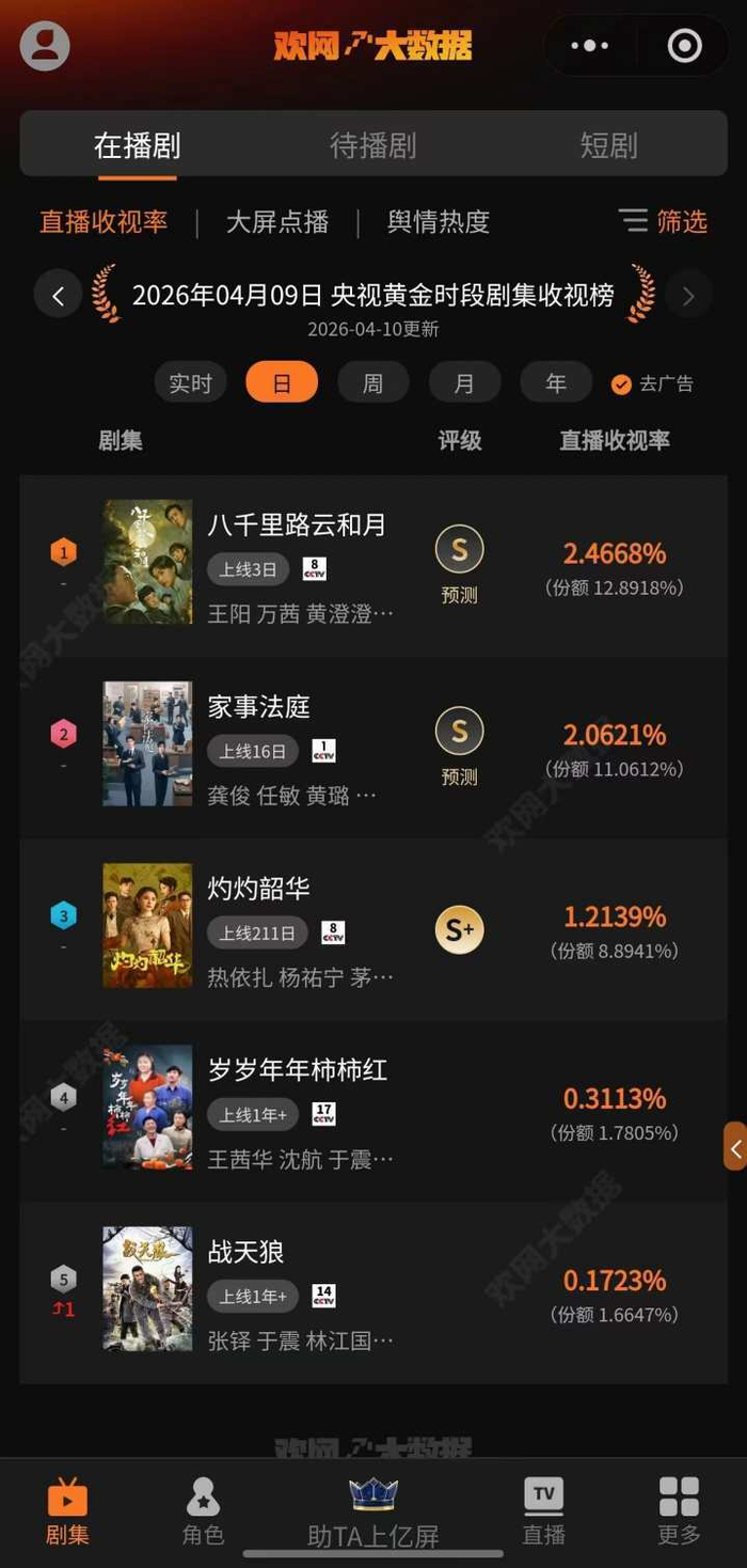 4月9日 欢网大数据【央视黄金时段】剧集直播收视率来啦!