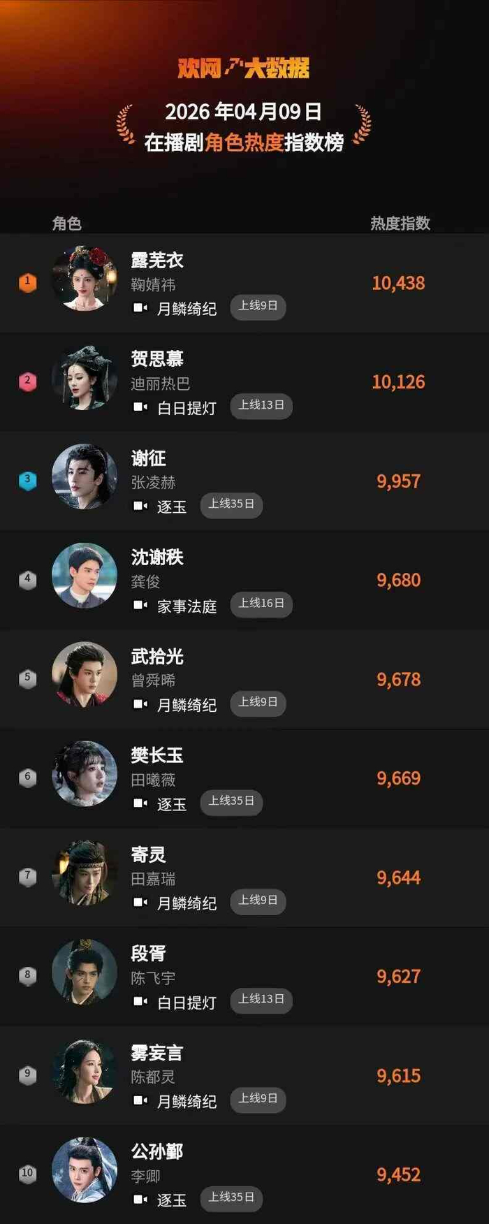 4月9日 欢网大数据【在播剧】角色热度指数TOP10来啦!