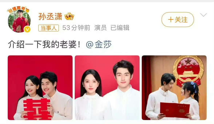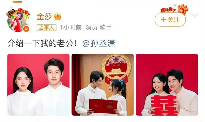 今日,娱乐圈被一则突如其来的喜讯刷屏。歌手金莎与演员孙丞潇同步在微博晒出红底结婚登记照,金莎霸气配文“介绍一下我的老公”,孙丞潇则甜蜜回应“介绍一下我的老婆”。两张照片、两句简单的宣言,宣告这段曾因19岁年龄差而备受争议的姐弟恋,终于修成正果。巧合的是,当天恰逢两人合体参与的夫妻观察综艺《妻子的浪漫旅行2026》首播,节目中他们正以“备婚情侣”身份筹备领证,而现实里早已在情人节前夕低调完成登记,这种节目与现实的“梦幻联动”,让这场官宣更添戏剧性。