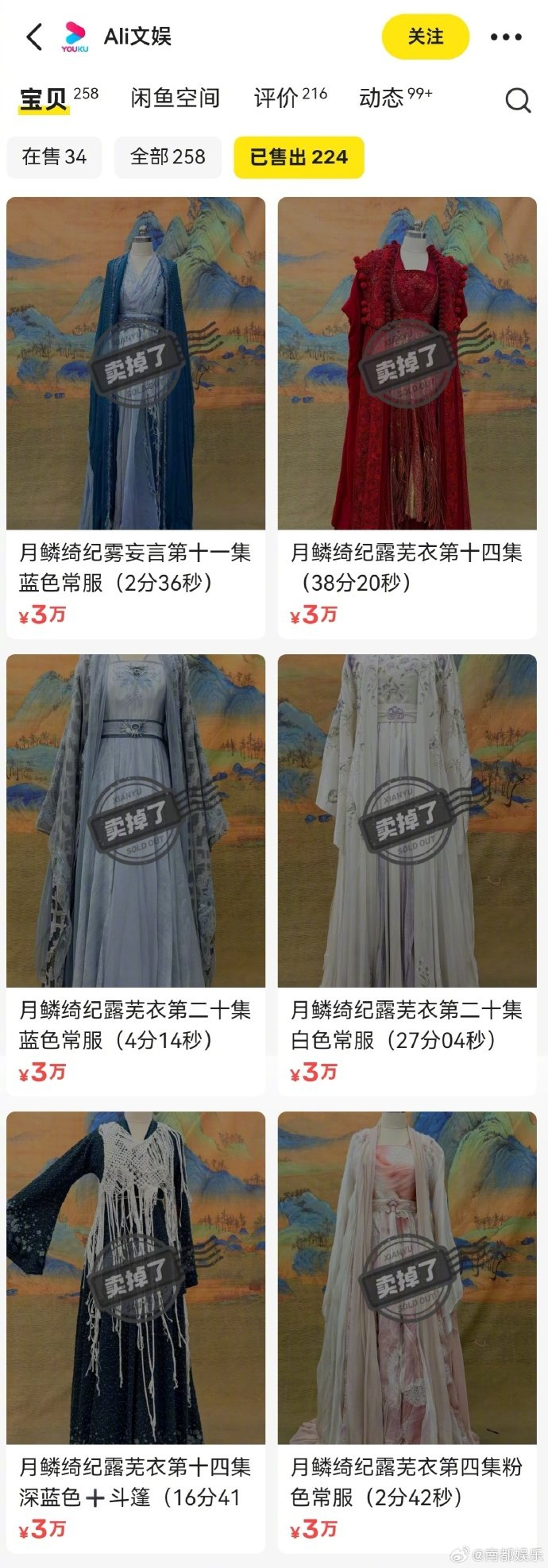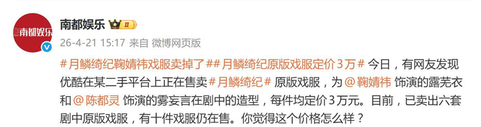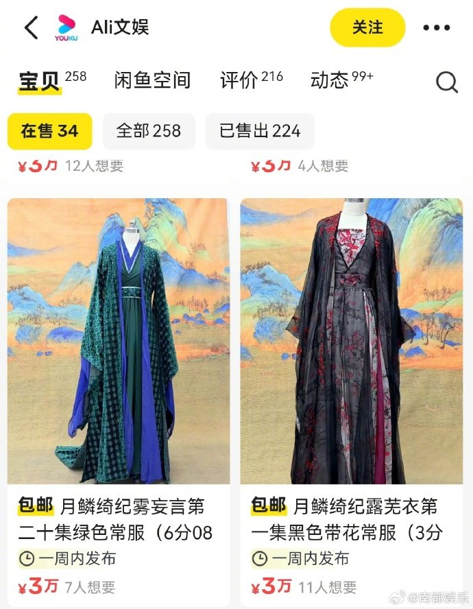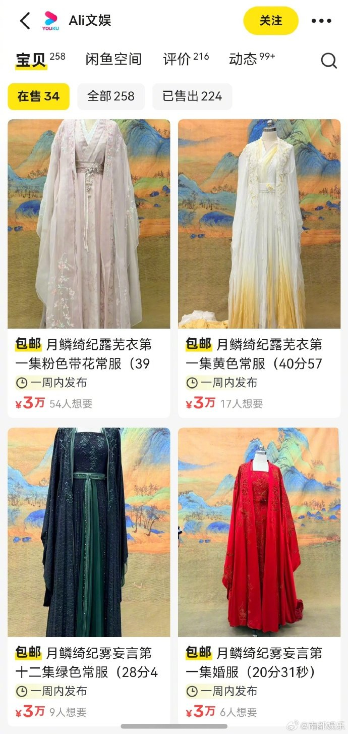 据4月21日报道,最近,有网友发现优酷官方在某二手平台上“悄悄”干起了副业——直接售卖热播剧《月鳞绮纪》中的原版戏服。主角鞠婧祎饰演的“露芜衣”和陈都灵饰演的“雾妄言”的剧中造型赫然在列,每件定价清一色3万元。这波操作迅速引发围观,而更让人惊讶的是,目前已有六套显示“售罄”,粉丝的购买力可谓相当直接。