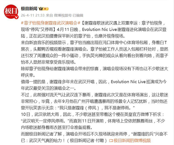 1. **章子怡来串门** ,一张演唱会门票就能遇见章子怡,这也太划算了吧! ,2. **星光闪闪** ,谢霆锋的演唱会才开场,就被章子怡的存在点亮了! ,3. **鸭舌帽妹主** ,章子怡的白T黑衣造型太高级了,鸭舌帽让她更有萌态! ,4. **双本命相遇** ,谢霆锋台上唱着,章子怡台下看着,难怪粉丝说是“一张门票圆梦两人”! ,5. **演唱会太给力** ,谢霆锋演唱会前有暴雨,后来直接停了,武汉的天气也太贴心了! ,6. **天气太给力** ,本来以为谢霆锋是“停风”神,没想到武汉的天气也跟着当他啊! ,7. **谢霆锋的兵更狂** ,内场观众都穿雨衣,结果没想到章子怡现身,气氛直接拉满! ,8. **谢霆锋的演唱会更有看点** ,谢霆锋演唱会上不仅有音乐,还有章子怡的意外亮相,真是看得太开了! ,9. **武汉的幸运儿** ,听说武汉人不仅能见到谢霆锋,还能遇到章子怡,真是太幸运了! ,10. **谢霆锋的兵们狂喜** ,谢霆锋演唱会开场后雨停了,现场气氛直接升温,谢霆锋的兵们太开心了!1. **网友A**:这波谢霆锋演唱会不仅是“双本命”相遇,还是“双风”相助!武汉的天气果然太给力了! ,2. **网友B**:章子怡一身白T黑衣,简直就是“白月光”,现场所有男生都被她秒清空! ,3. **网友C**:谢霆锋演唱会的彩蛋是不是太绝了?章子怡的包厢门被她自己打开了?这也太高科技了吧! ,4. **网友D**:看来武汉的天气不仅会下雨,还会为演唱会停风!这次演出真是“双喜临门”! ,5. **网友E**:谢霆锋的演唱会不仅有感动,还有惊喜,章子怡的出现彻底点燃了现场的星光! ,6. **网友F**:从包厢栏杆看,章子怡的存在感不仅在台下,估计在谢霆锋的演唱会里她也被吸引了! ,7. **网友G**:武汉的歌迷们真是太幸运了!演唱会不仅有谢霆锋的精彩表演,还有章子怡的意外现身! ,8. **网友H**:谢霆锋的演唱会真是“门票圆梦”啊,一边是台上演唱一边是台下现身,双本命相遇,太感动了! ,9. **网友I**:章子怡在包厢里的表现更是让人看傻!她看着演唱会桌子上的荧光棒,估计也想上台跳舞吧! ,10. **网友J**:武汉的天气果然太神奇了!从暴雨到突然停风,演出前后的天气变化简直是为演唱会量身定制的!