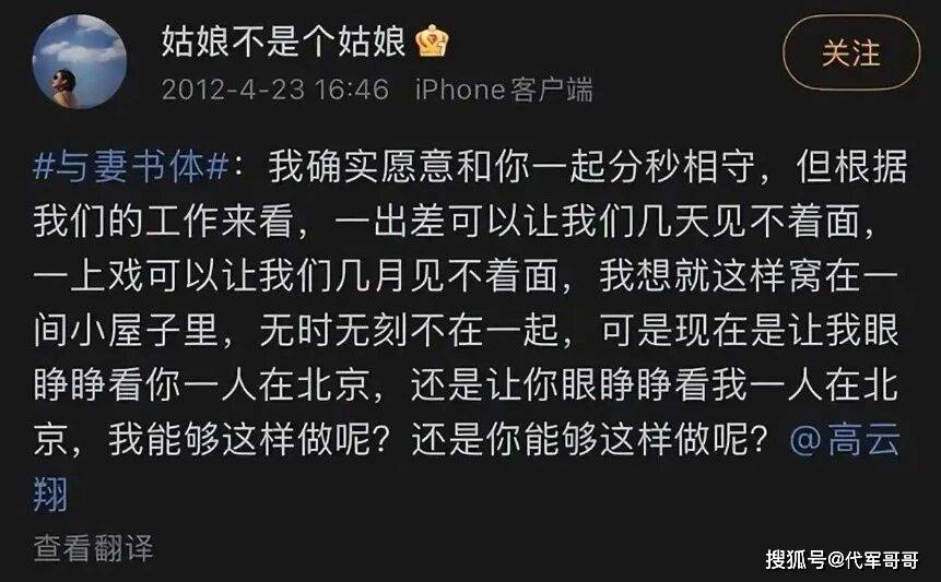 除了时间线,当年的暧昧痕迹与实锤画面,更让这段隐秘关系无处遁形。2012年,张婉婷的身份正是高云翔的助理兼经纪人,长期贴身陪伴在其身边,具备高频接触的条件。同年4月,张婉婷在社交平台发布一条微博,文案风格酷似《与妻书》,深情告白并@高云翔,而高云翔当时并未参演该片,这一举动显得格外反常,被网友解读为隐晦的情感表达。