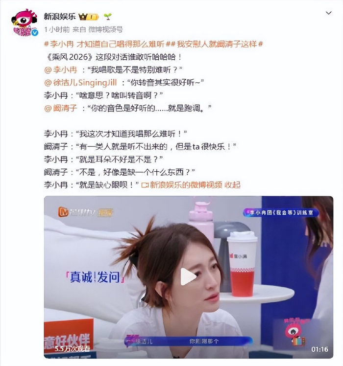 据4月18日报道,《乘风2026》二公训练的一段对话,直接让节目效果“炸”上了热搜。当李小冉一脸真诚地向队友发出灵魂拷问“我唱歌是不是特别难听?”时,一场关于“跑调而不自知”的幽默解剖就此展开,其反差感让网友直呼“这段对话谁敢听哈哈哈!”