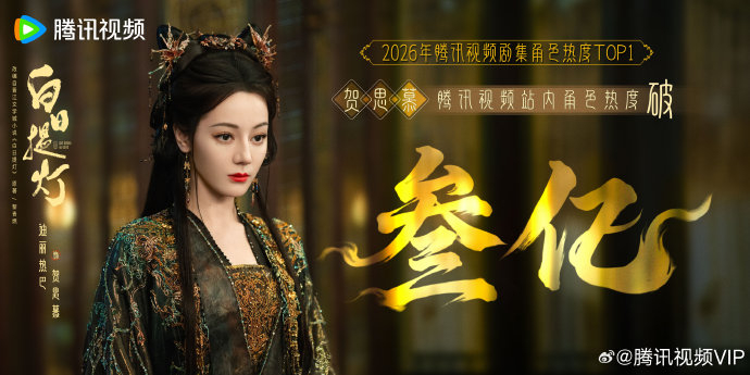 迪丽热巴在奇幻剧《白日提灯》中饰演的鬼王"贺思慕"于2026年4月13日腾讯视频站内角色热度突破3亿,成为平台年度剧集角色热度总榜TOP1,刷新了腾讯视频历史纪录。