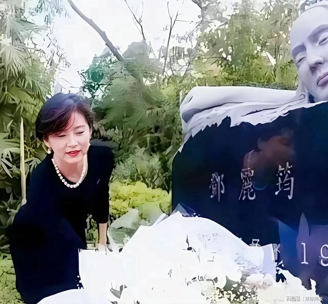 1998年,林青霞为邓丽君扫墓的留影。镜头下的林青霞身着一身黑衣、颈间戴着白珍珠项链,静静立于邓丽君的墓碑前,温柔地献上白玫瑰。