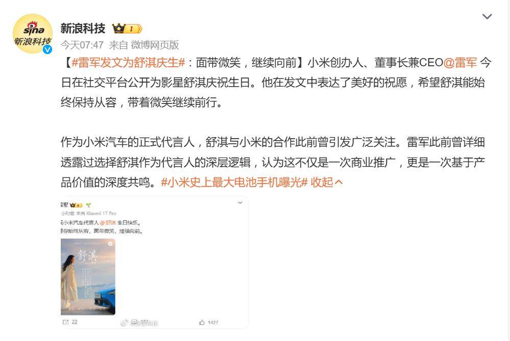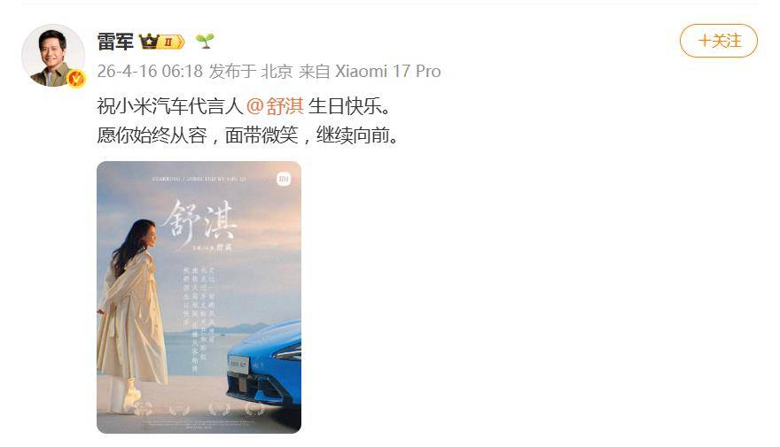4月16日,小米集团CEO雷军的一则生日祝福,成功在社交平台刷出了跨界存在感。他直接@了品牌代言人舒淇,并写道:“祝小米汽车代言人舒淇生日快乐。愿你始终从容,面带微笑,继续向前。”这波操作被网友迅速捕捉,直呼“第一次见企业一把手亲自下场为代言人公开庆生”。