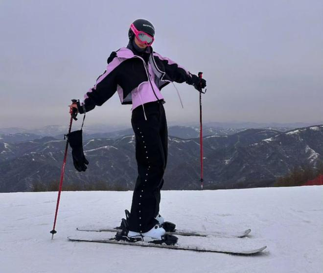 再比如,张馨予穿着紫色+黑色外套,腿上则是黑色运动裤,裤腿看着比较宽松。这样的设计有助于滑雪,因为裤腿过于紧绷,可能会影响发挥。