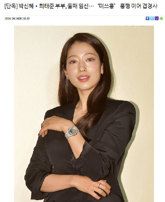 2026年4月14日,韩国媒体及多位演艺界相关人士证实,演员朴信惠已怀上二胎,预产期定于2026年秋季,她将暂停演艺活动专心休养,与丈夫崔泰俊共同期待家庭新成员的到来。