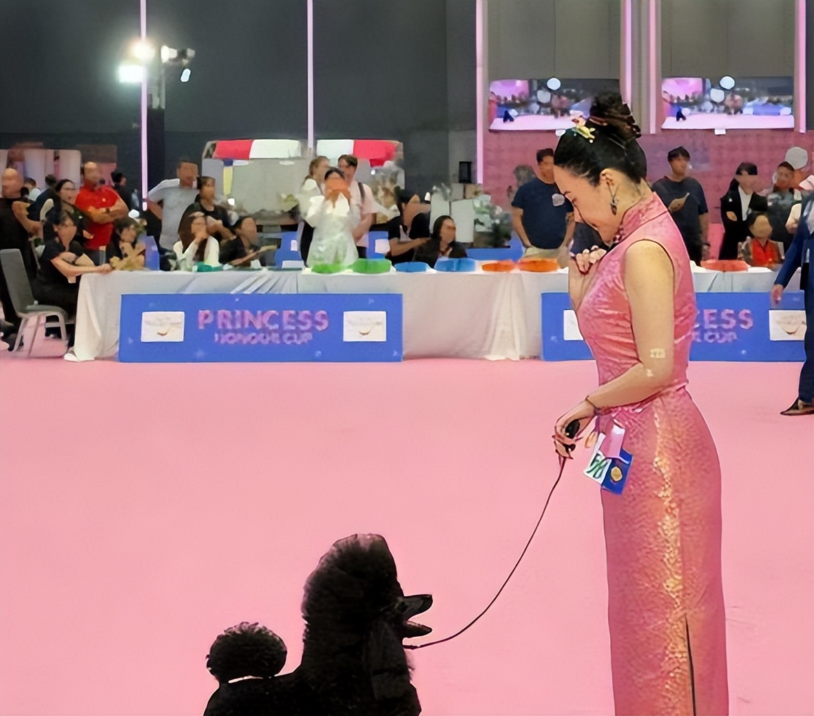 2026 年 4 月初,泰国曼谷公主杯国际犬展的赛场上,一个穿着蜜桃粉色改良旗袍、素颜盘发的中国女人牵着一只中型贵宾犬走了上去。