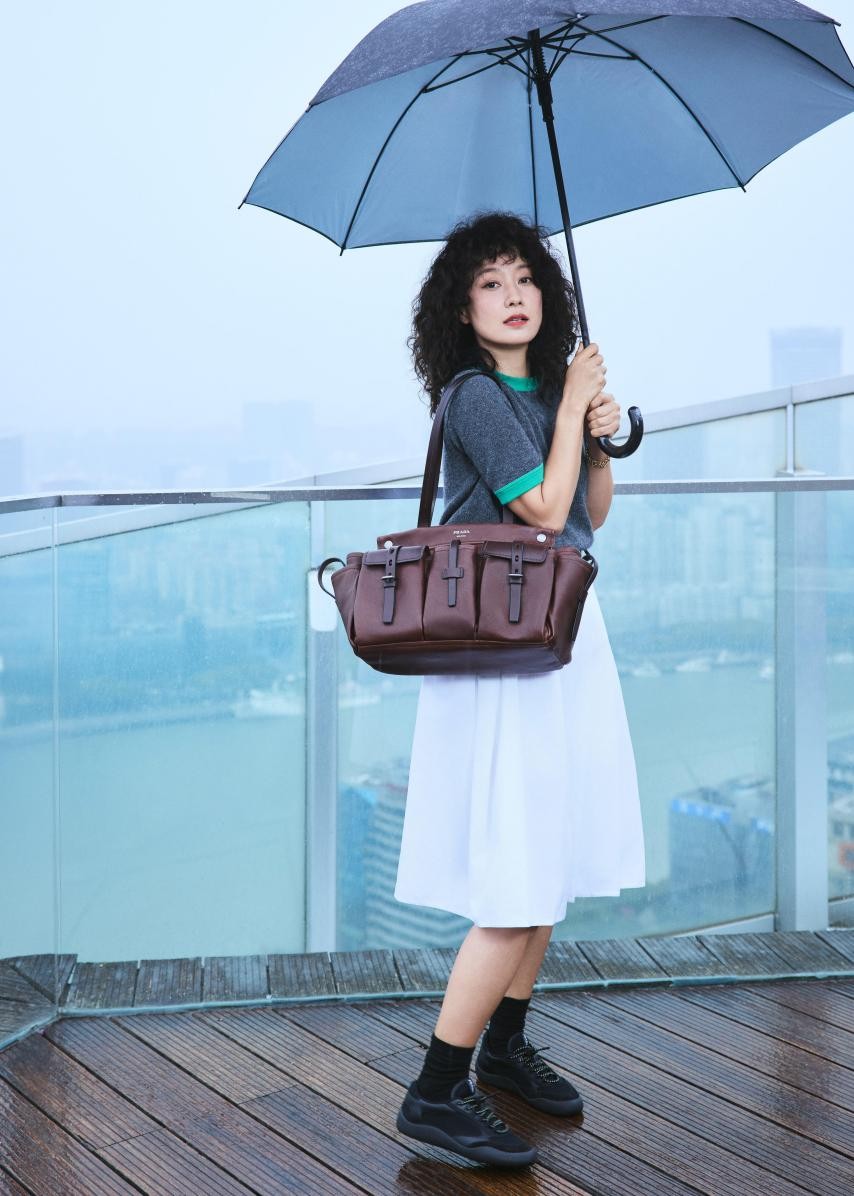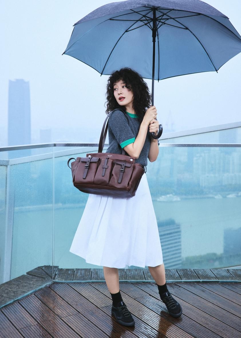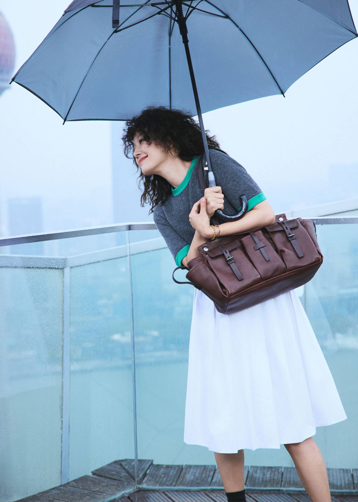 除此以外,身上挎了一个深棕色的皮质大包,包包的版型挺括,上面有几个口袋和搭扣的设计,看着很有质感,容量也大,既能当装饰又很实用。这身搭配,可以说是把温柔的针织短袖、清爽的白裙子和酷一点的运动鞋结合在一起,风格特别平衡。