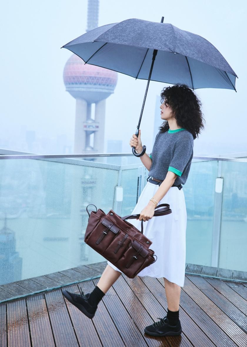 这种伞裙自带一种优雅的氛围感,走动的时候裙摆散开,在显气质上可谓是毫不费力。黑色乐福鞋与裙子颜色保持一致,鞋型简约又百搭,一脚蹬的设计穿脱方便,还透着点随性的英伦风。肩膀上挎着一个棕褐色的皮质小包,包身带着自然的皮质纹理,金属链条肩带中和了皮质的厚重感,让整体风格更精致一些。