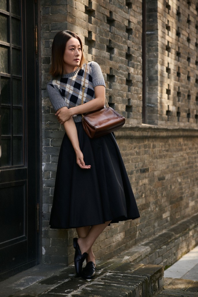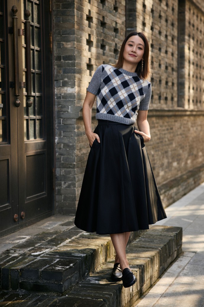 这件T恤一出现,就特有复古味儿,灰底配上黑棕两色的菱格图案,看着特别有学院风的感觉,经典又不容易过时。针织的面料摸起来必然软乎乎,袖子长度刚好卡在小臂,这种长度既不会勒胳膊,又能露出手腕线条,显得整个人很利落。下半身搭了一条纯黑色的半身伞裙,裙子版型很挺括,裙摆是大裙摆的设计,垂坠感十足,长度到小腿肚附近,既能遮住腿部线条,又不会显得拖沓。