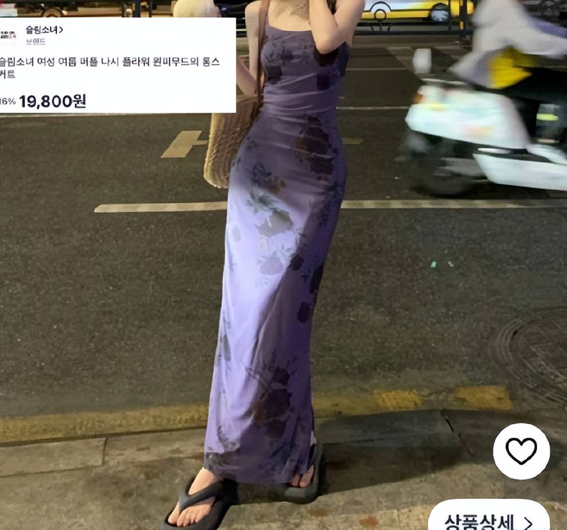 写真中,柳智敏立于樱花树下,身着一袭淡紫色水墨网纱雪纺长裙。裙子采用收腰剪裁与不规则开叉设计,外搭彩色针织开衫,垂坠感面料在光影中流动,与她清冷灵动的气质结合,营造出朦胧的春日仙气。然而,这款被赞“仿佛高定”的裙子,在韩国电商平台的售价折合人民币仅约92元(19800韩元),与明星造型中动辄成千上万的奢侈单品形成巨大反差。