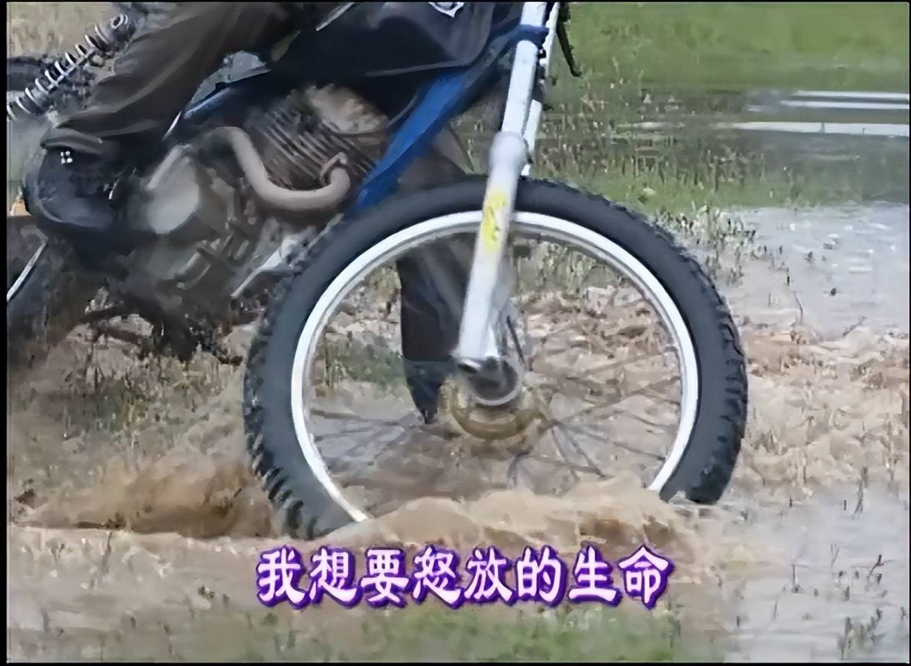 张雪的摩托车的改装非常有创意,他在车轮上焊接了两块铁皮作为漂行时的滑水板。
