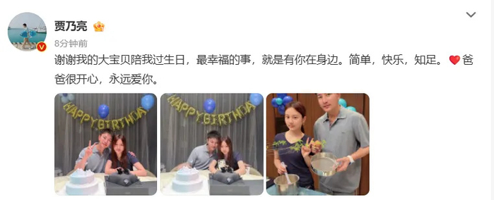 贾乃亮搂着甜馨拍了张合照,在微博上写道:“谢谢我的大宝贝陪我过生日,最幸福的事,就是有你在身边。简单,快乐,知足。爸爸很开心,永远爱你。”照片里父女俩紧靠在一起,贾乃亮笑得眼睛眯成缝,甜馨靠在他肩头,画面简单却看得人心头一暖。
