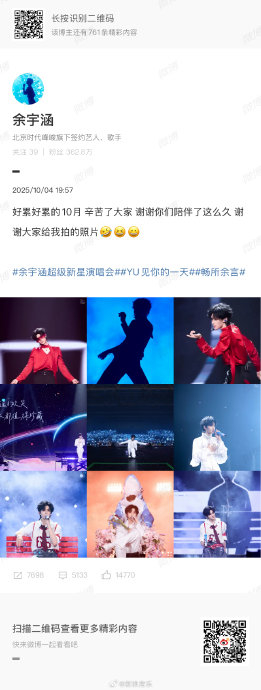 最近的热度高峰出现在 2026 年 4 月 9 日,余宇涵被偶遇现身张杰“未·LIVE 开往 1982"巡回演唱会 。他不仅沉浸式听歌,还被张杰邀请登上舞台小火车互动,期间因专注与镜头互动差点摔倒的可爱瞬间被广泛传播 。这一举动被媒体称为“梦幻联动”,路人镜头下的他状态轻松,玩得十分开心 。从 2025 年的个人演唱会到 2026 年的多栖发展,余宇涵用密集的行程和高质量的舞台,诠释了“超级新星”的成长之路,未来在音乐与影视领域的表现依然值得期待。