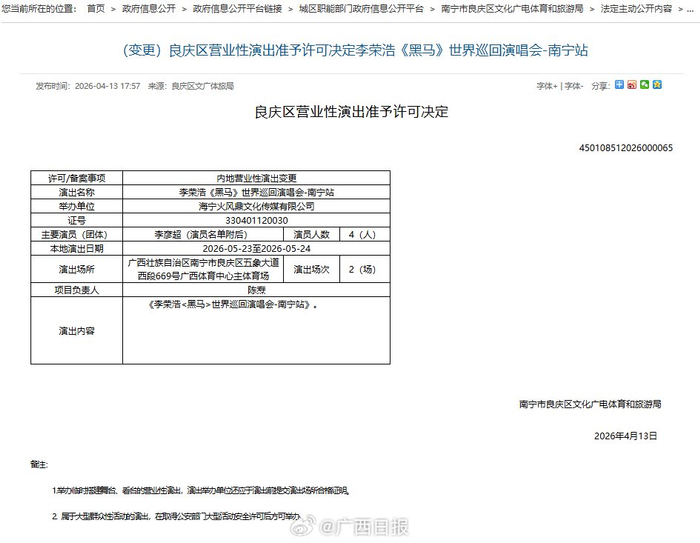 #李荣浩南宁演唱会连唱两晚#【演出场次加码!李荣浩《黑马》世界巡回演唱会-南宁站,连唱两晚】4月13日,南宁良庆区文广体旅局在广西南宁市良庆区人民政府官网上发布【(变更)良庆区营业性演出准予许可决定李荣浩《黑马》世界巡回演唱会-南宁站】消息,内容显示李荣浩《黑马》世界巡回演唱会-南宁站本地演出日期调,整为2026年5月23日至2026年5月24日,演出场次为2场。
