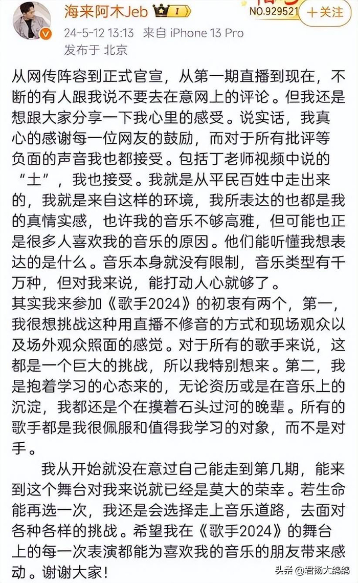 可海来阿木没急眼也没卖惨,直接在微博上写了篇小作文,大大方方地接下了这个土的帽子。