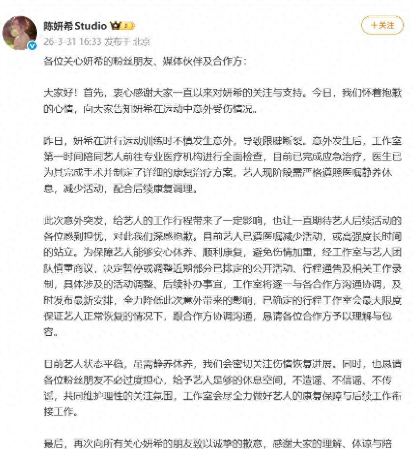 3月31日,陈妍希工作室发文确认,一个让不少粉丝揪心的消息来了,陈妍希在前一天做运动训练时发生意外,跟腱断裂,已经完成手术,接下来要进入一段时间的静养和康复。
