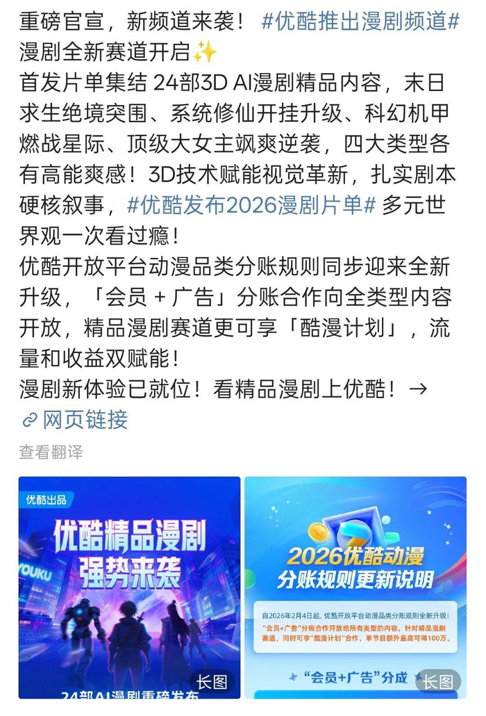 相比前两年短剧春节档,今年短剧市场被寄予厚望的则是风口上的AI漫剧。头部视频平台爱奇艺、优酷、腾讯视频等均以在春节前夕加码漫剧布局,如优酷推出涵盖大女主、末日、修仙、科幻四大品类漫剧片单等。