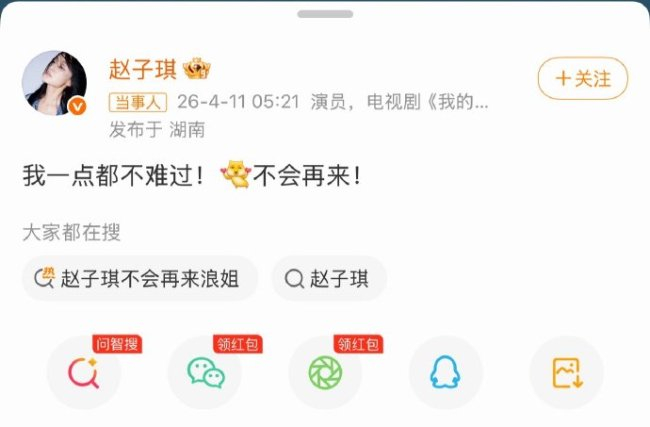 2026年4月11日凌晨,演员赵子琪在《乘风2026》一公淘汰后于微博发文,用“我一点都不难过!不会再来!”的简短宣言表明立场。她在直播中进一步强调不参与复活赛,淘汰后直接返京,并坦言“被淘汰是解脱”。面对网友“因流量低被淘汰”的质疑,她仅以“哦好的”转发回应,被解读为对节目流量逻辑的无声抗议。