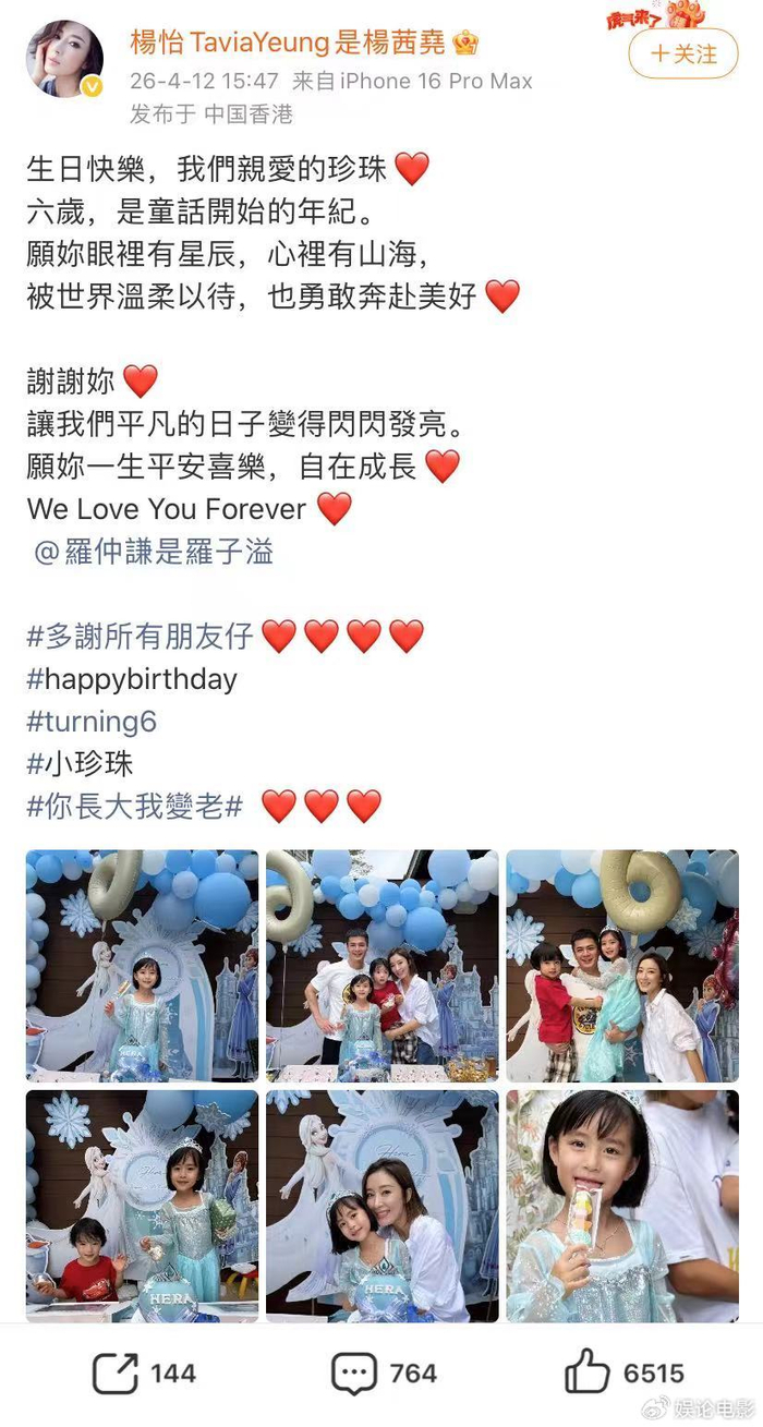 2026年4月12日,杨怡(现名杨茜尧)在社交平台晒出全家福,为女儿小珍珠庆祝6岁生日。照片中,小珍珠身穿蓝色爱莎公主裙,头戴皇冠,甜美可人,宛如从童话中走出的小公主;弟弟Eden则身穿红色T恤配格纹裤,虎头虎脑,眼神清澈,被网友称为“迷你版罗仲谦”。罗仲谦一手抱着女儿,一手抱着儿子,杨怡依偎身旁,一家四口笑容灿烂,画面温馨有爱。