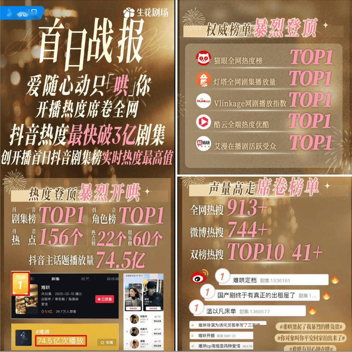 该剧首播当天就在灯塔、猫眼、骨朵、夸克等专业数据榜单拿下播放量top1的成绩;开播不到24小时,就以“暴烈”姿态席卷全网,拿下热搜主榜38个、文娱榜19个、出圈热点117个,直接超越同期10部热门剧集。在抖音,《难哄》是热度最快破3亿的剧集,更创下开播首日剧集榜实时最高热度值。
