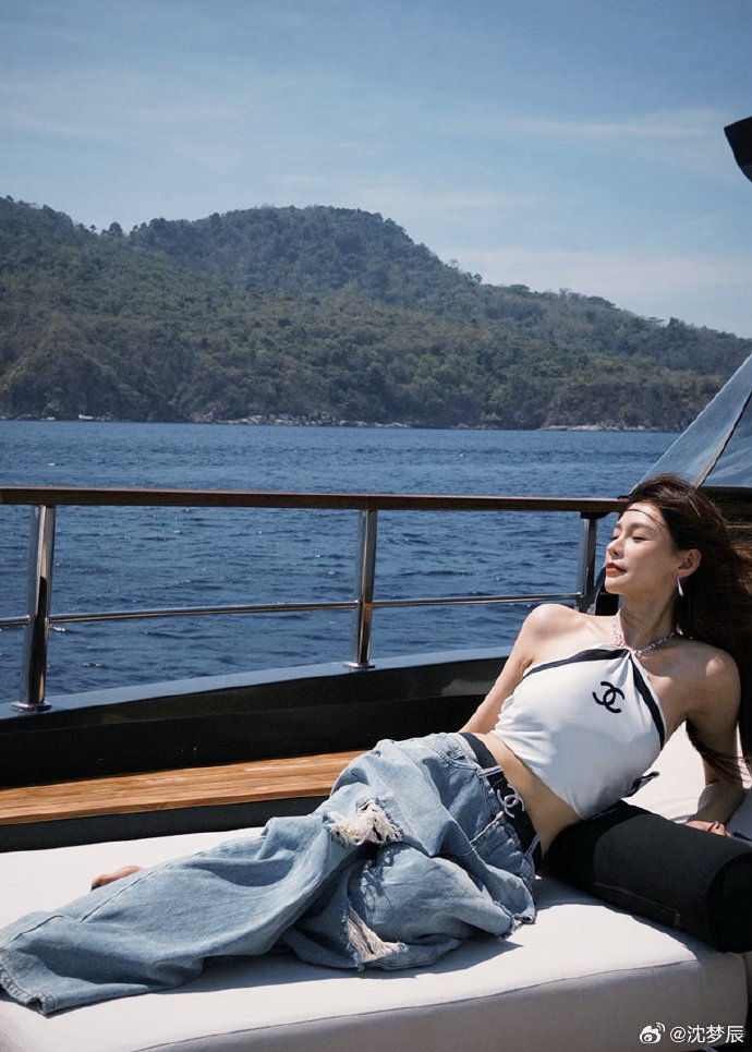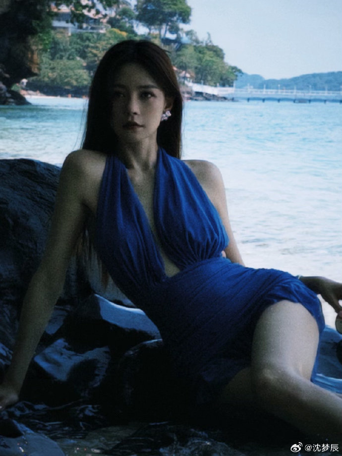 她换上宝蓝色深 V 吊带裙是整套照片里最亮眼的一笔,她倚着游艇座椅,眼神清冷又明艳,把海边的热烈与自身的飒爽完美融合。这套造型里的她,是舞台上光芒万丈的主持人,也是爱情里清醒独立的沈梦辰。