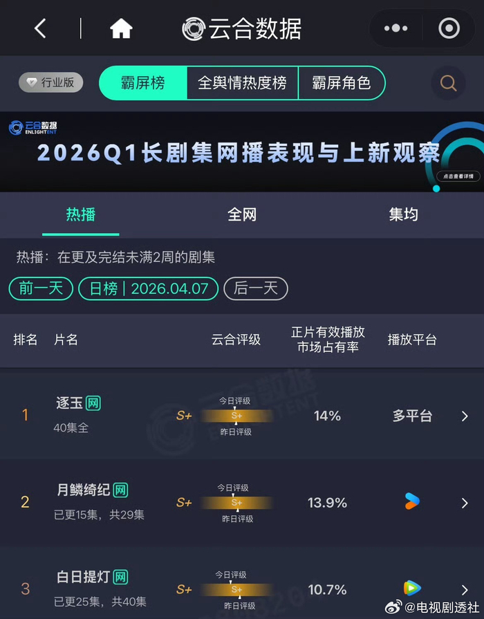 恭喜张凌赫,田曦薇逐玉云合连续登顶33天!各平台都在上大剧上新剧,逐玉还是保持第一 !逐玉牛!🐮